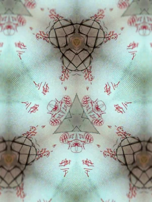 These digital prints are mirrored segments of a diagram that was hand-drawn in coloured biro by a scientist in the Control Room of the Large Hadron Collider, CERN in 2012. The diagram's meaning and annotation is unknown except that it pertains to the LHC. The finished works were printed as wallpaper which covered the gallery walls.