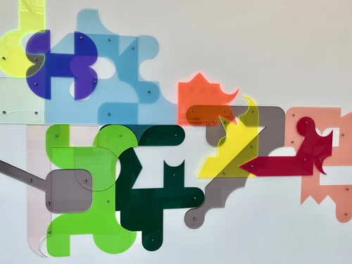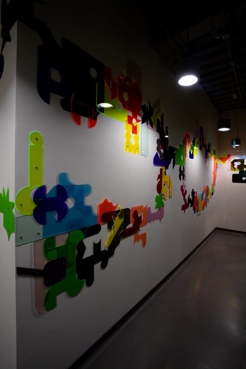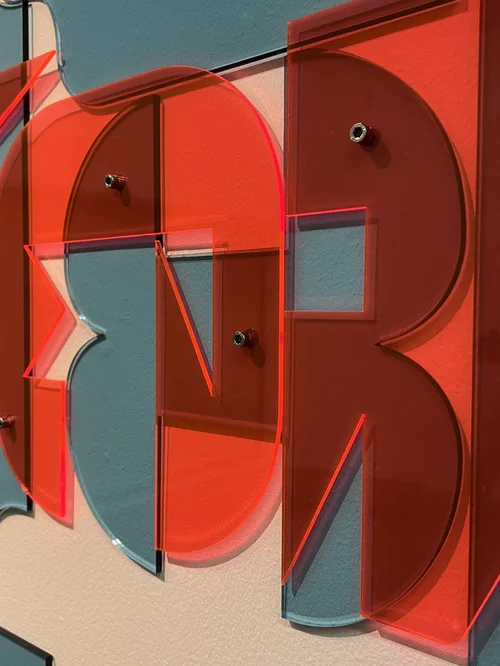 This 18 metre long commission was reworked from an original vinyl installation in 2017 to this lasercut acrylic piece in 2022. It wraps around 5 walls in a research location inspired by the experiments with light refraction that is part of the work there.